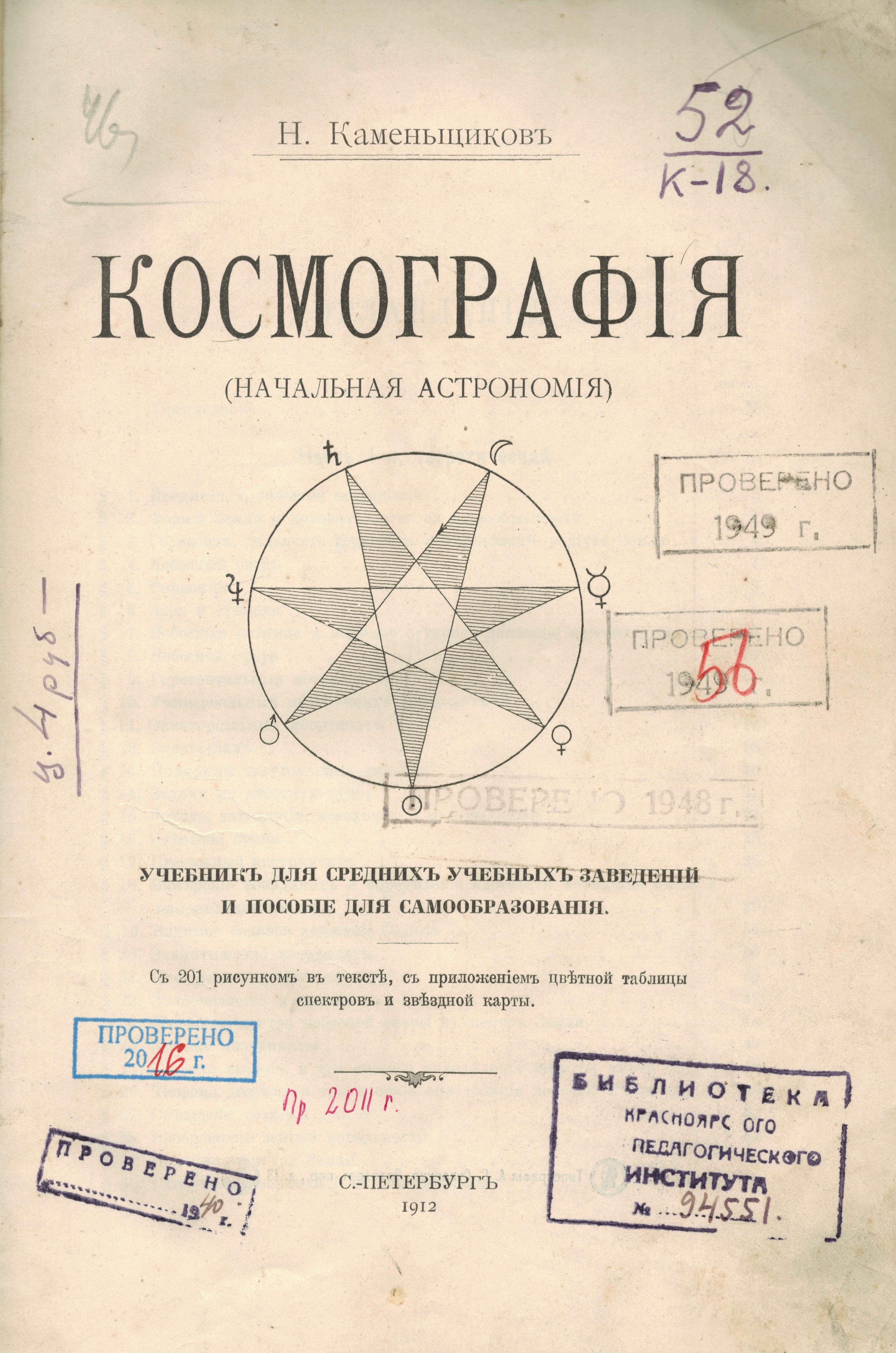 Каменщиков, Н. Космография (начальная астрономия) : учебник для средних учебных заведений и пособие для самообразования / Н. Каменщиков. - Спб. : Тип. А. С. Суворина, 1912. - 250 с.