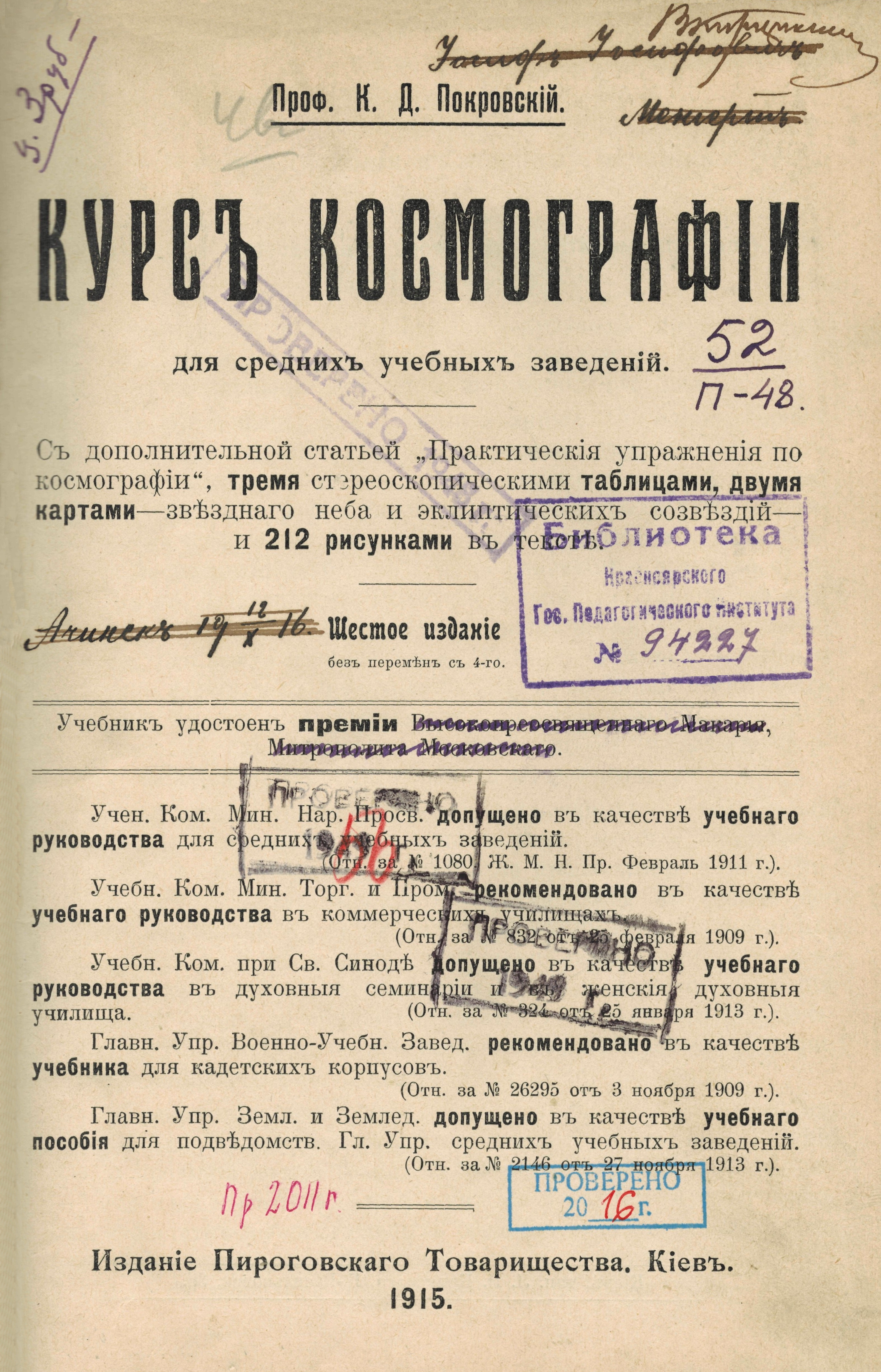 Покровский, К. Д. Курс космографии : для средних учебных заведений / К. Д. Покровский. - 6-е изд., доп. - Киев : Тип. Л. П. Кринскаго, 1915. - 212 с.
