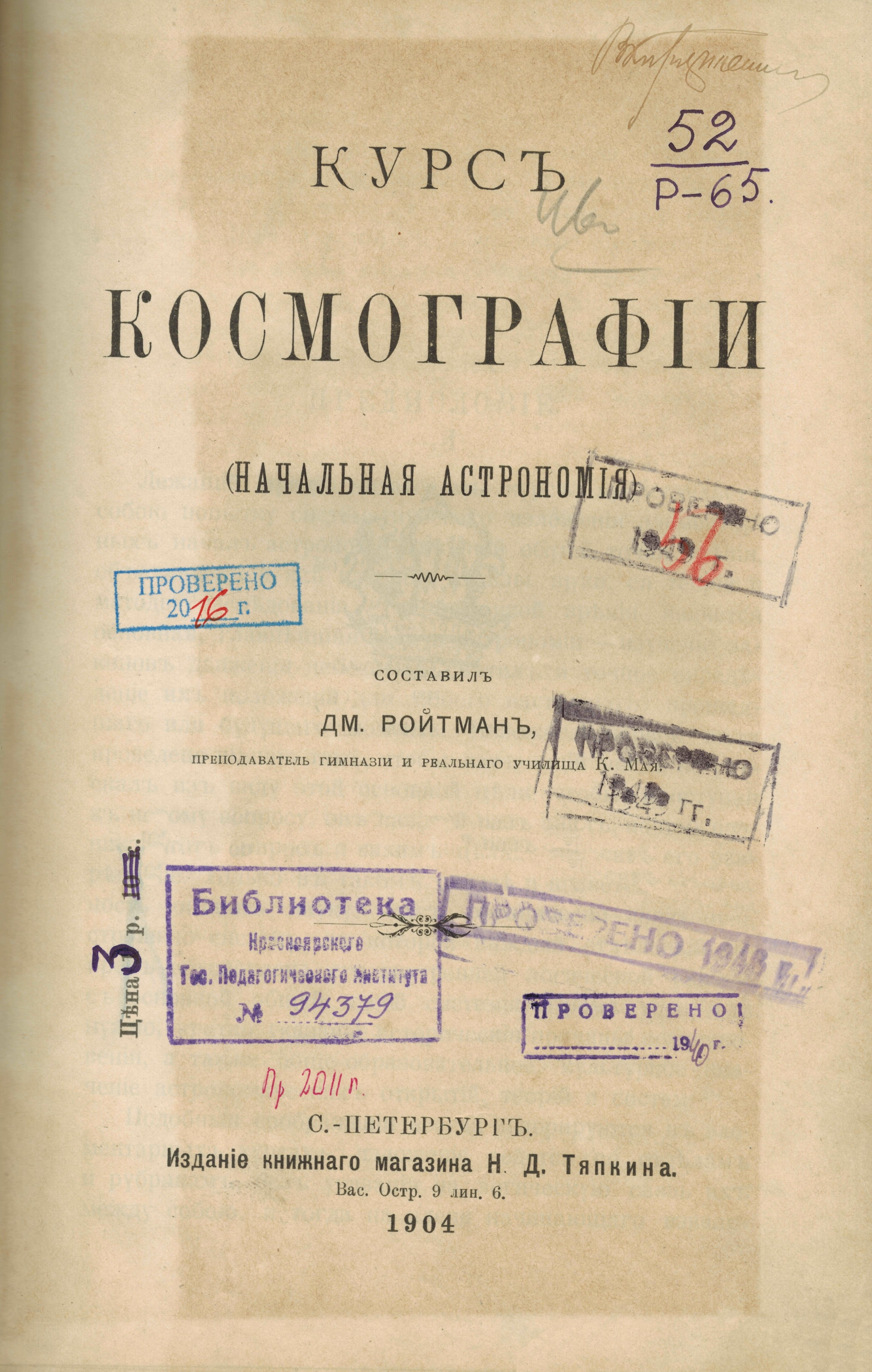 Ройтман, Д. В. Курс космографии : (Начальная астрономия) / сост. Дм. Ройтман. преп. гимназии и реал. уч-ща К. Мая. - Санкт-Петербург : Н.Д. Тяпкин, 1904. - 240 с.