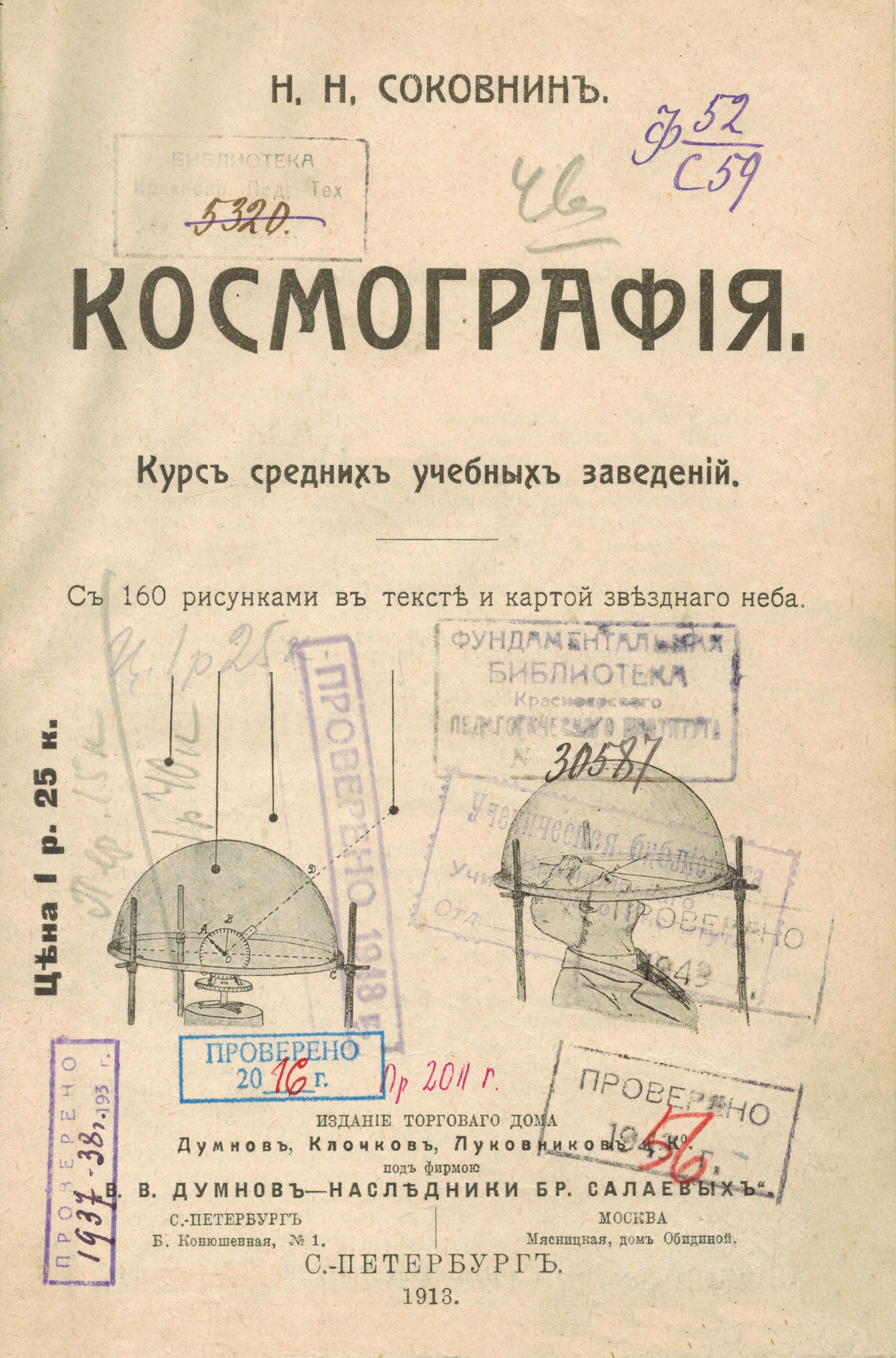 Соковнин, Н. Н. Космография : курс средних учебных заведений / Н. Н. Соковнин. – С.-Петербург : Издание торгового дома Думнов, Клочков, Луковников и Ко под фирмою В. Думнов – наследники бр. Салаевых, 1913. - 198 с.