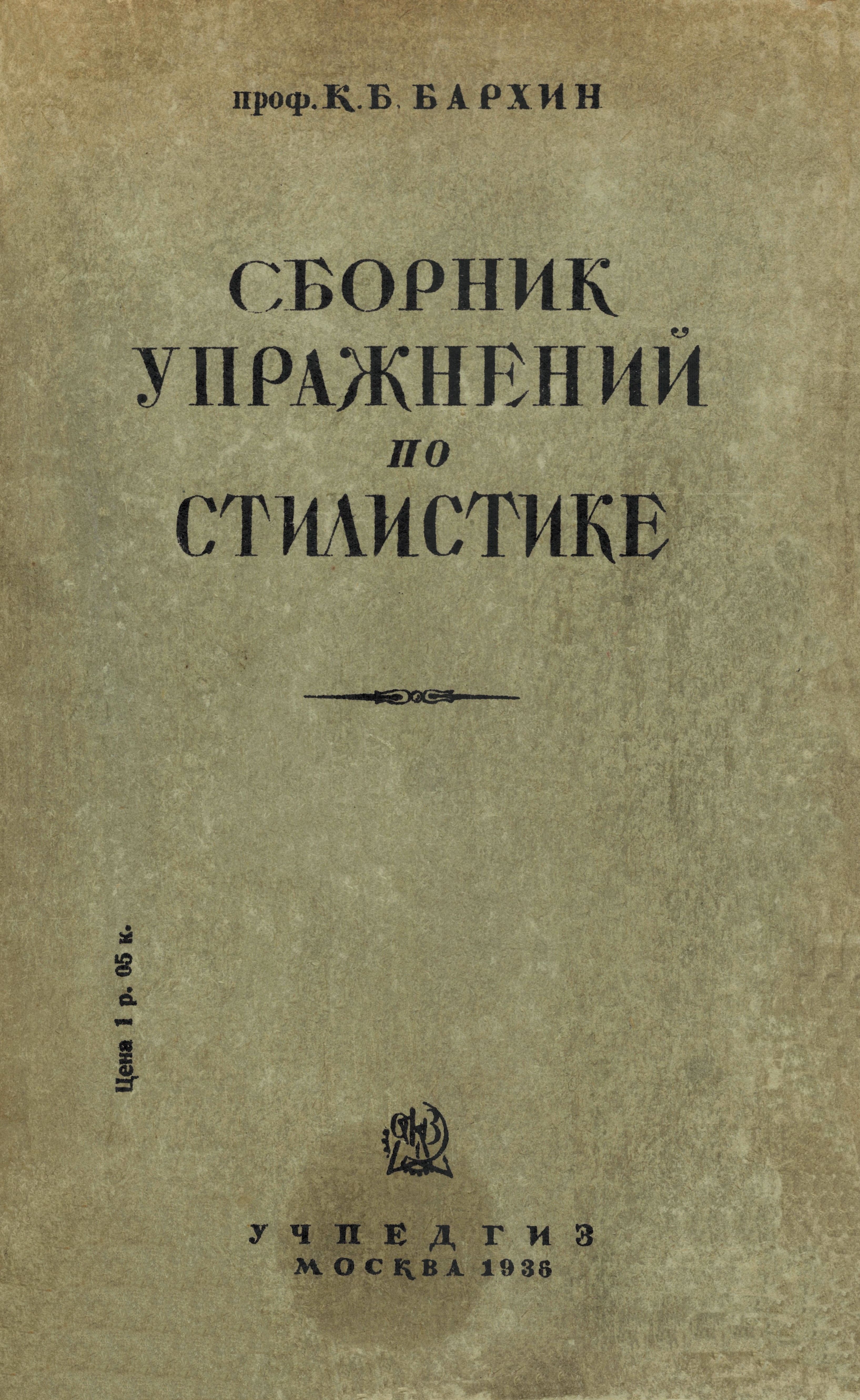 Бархин, Константин Борисович. Сборник упражнений по стилистике : учебник для 5-7 кл. неполной средней и средней школы / проф. К. Б. Бархин ; утв. Наркомпросом РСФСР. – 2-е изд. - Москва : Учпедгиз, 1936. - 127 с. : ил.