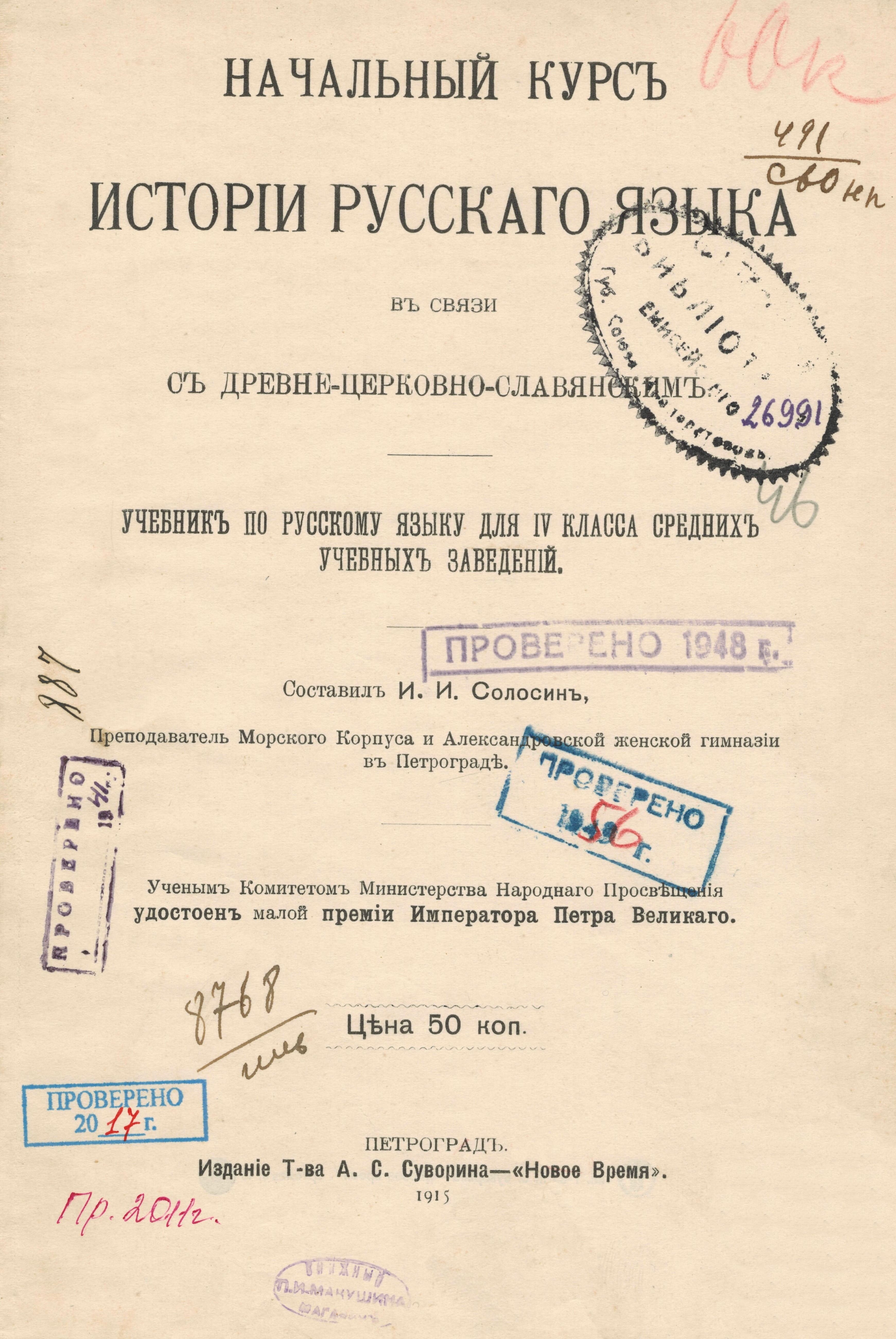 Солосин, Иван Иванович. Начальный курс истории русского языка в связи с древне-церковно-славянским : учеб. по рус. яз. для 4 кл. сред. учеб. заведений / сост. И. И. Солосин, преп. Мор. корпуса и Александр. жен. гимназии в Петрограде. - Петроград : Новое время, 1915. - VI, 96 с. : 1 л. карт.