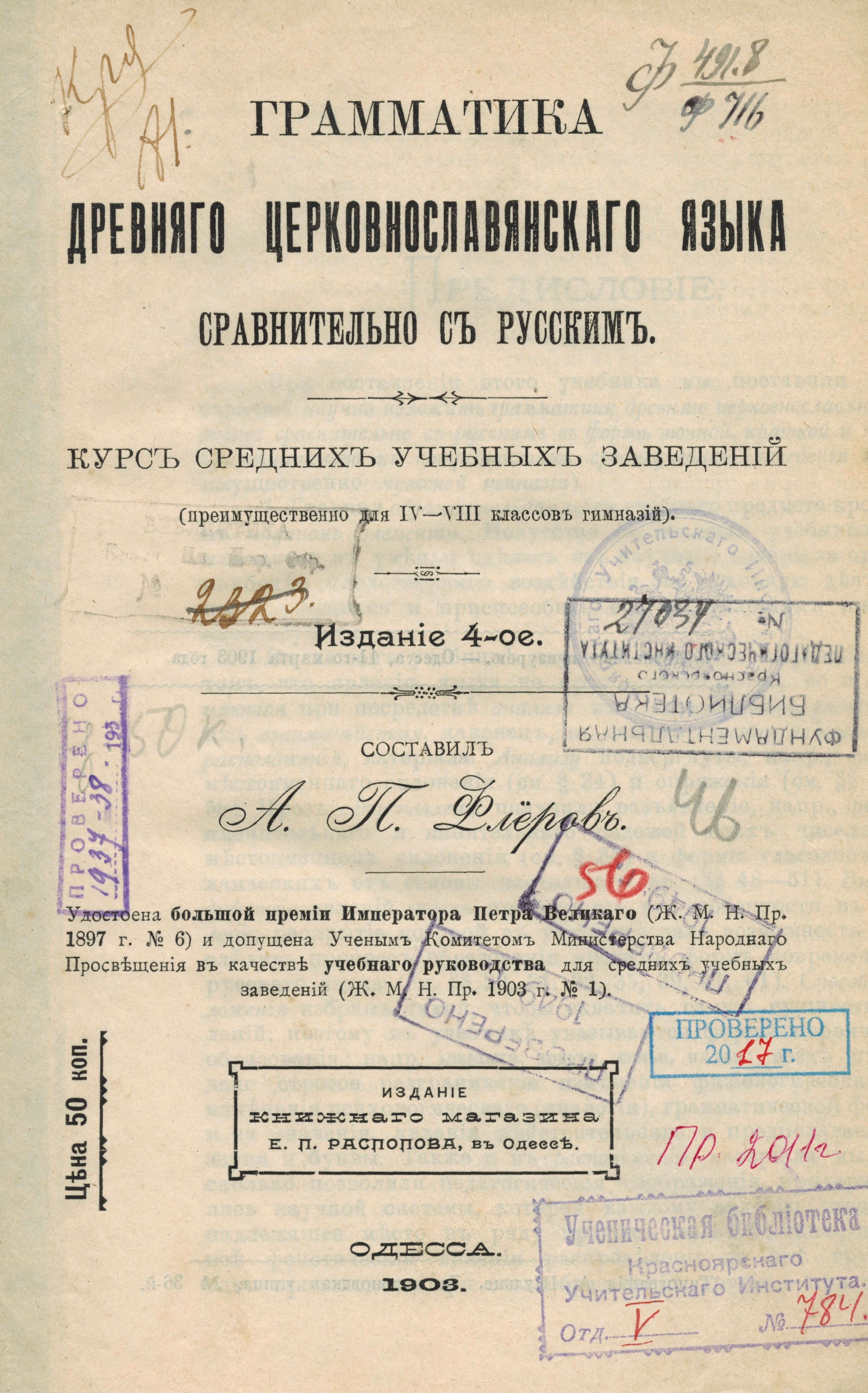 Флёров, А. П. Грамматика древнего церковнославянского языка сравнительно с русским : курс средних учебных заведений (преимущественно для 4-8 классов гимназий) / А. П. Флеров. - 4-е изд. - Одесса: Издание Е. П. Распопова, 1903. - 74 с.