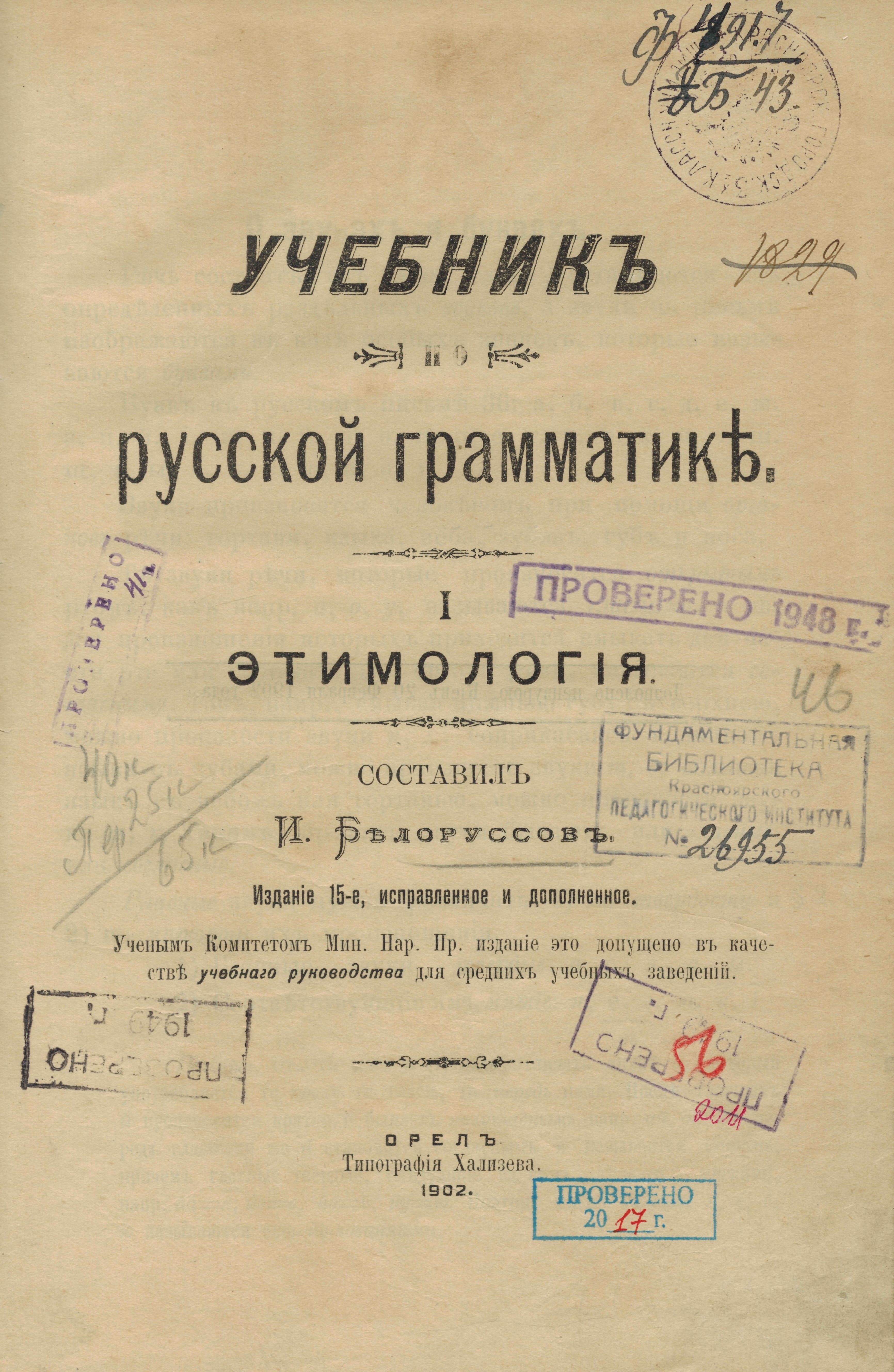 Белоруссов, Иван Михайлович. Учебник по русской грамматике. Ч. I. Этимология / сост. И. Белоруссов. - 15-е изд., испр. и доп. - Орел : тип. А. Н. Хализева, 1902.