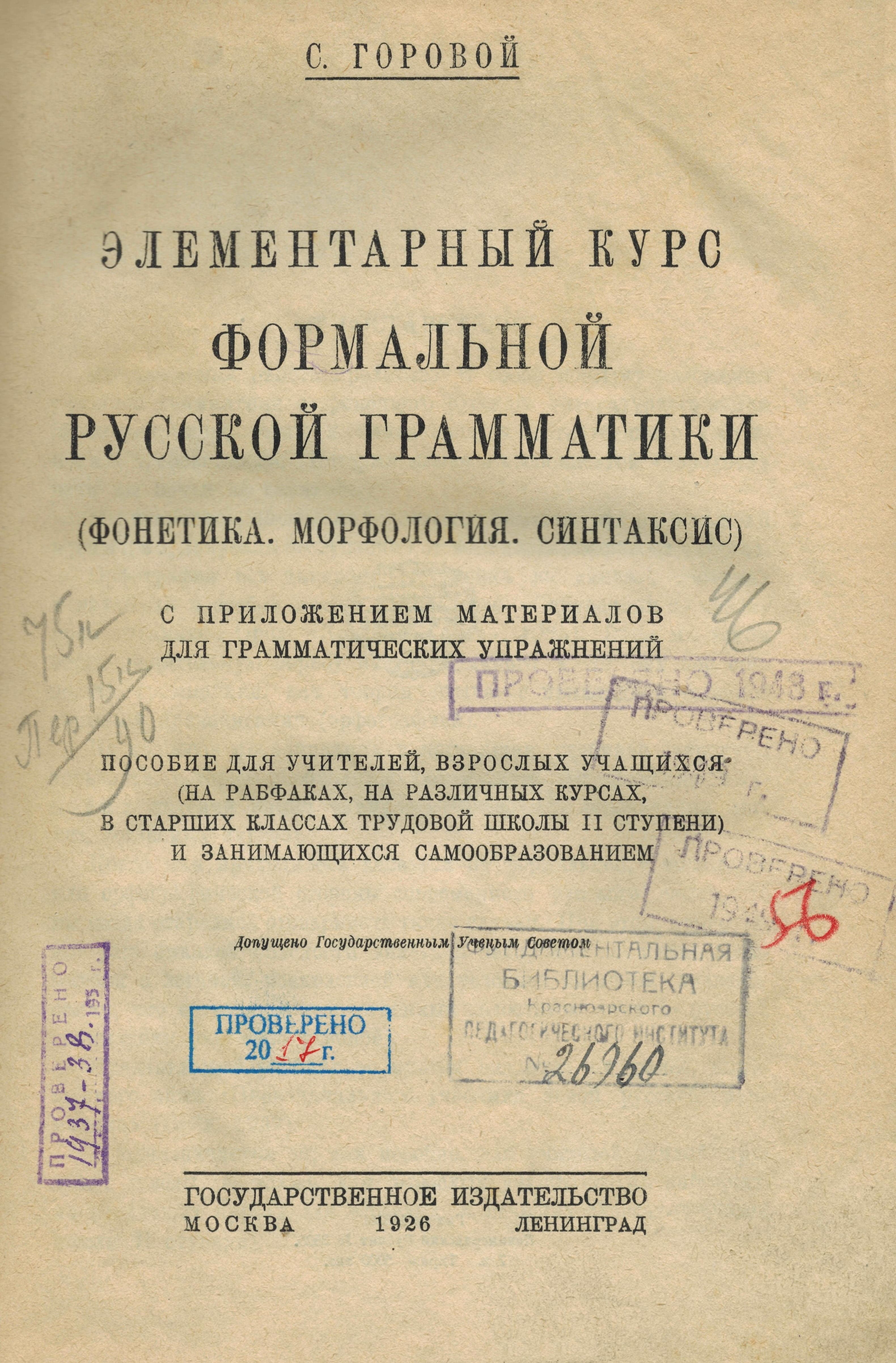 Горовой, С. Элементарный курс формальной русской грамматики (Фонетика. Морфология. Синтаксис). С прил. материалов для грамматич. упражнений : пособие для учителей, взрослых учащихся (на рабфаках, на различных курсах, в старших классах труд. школы II ступени) и занимающихся самообразованием / С. Горовой. - Москва ; Ленинград : Гос. изд-во, 1926 (Л. : тип. Печатный двор). - 112 с.