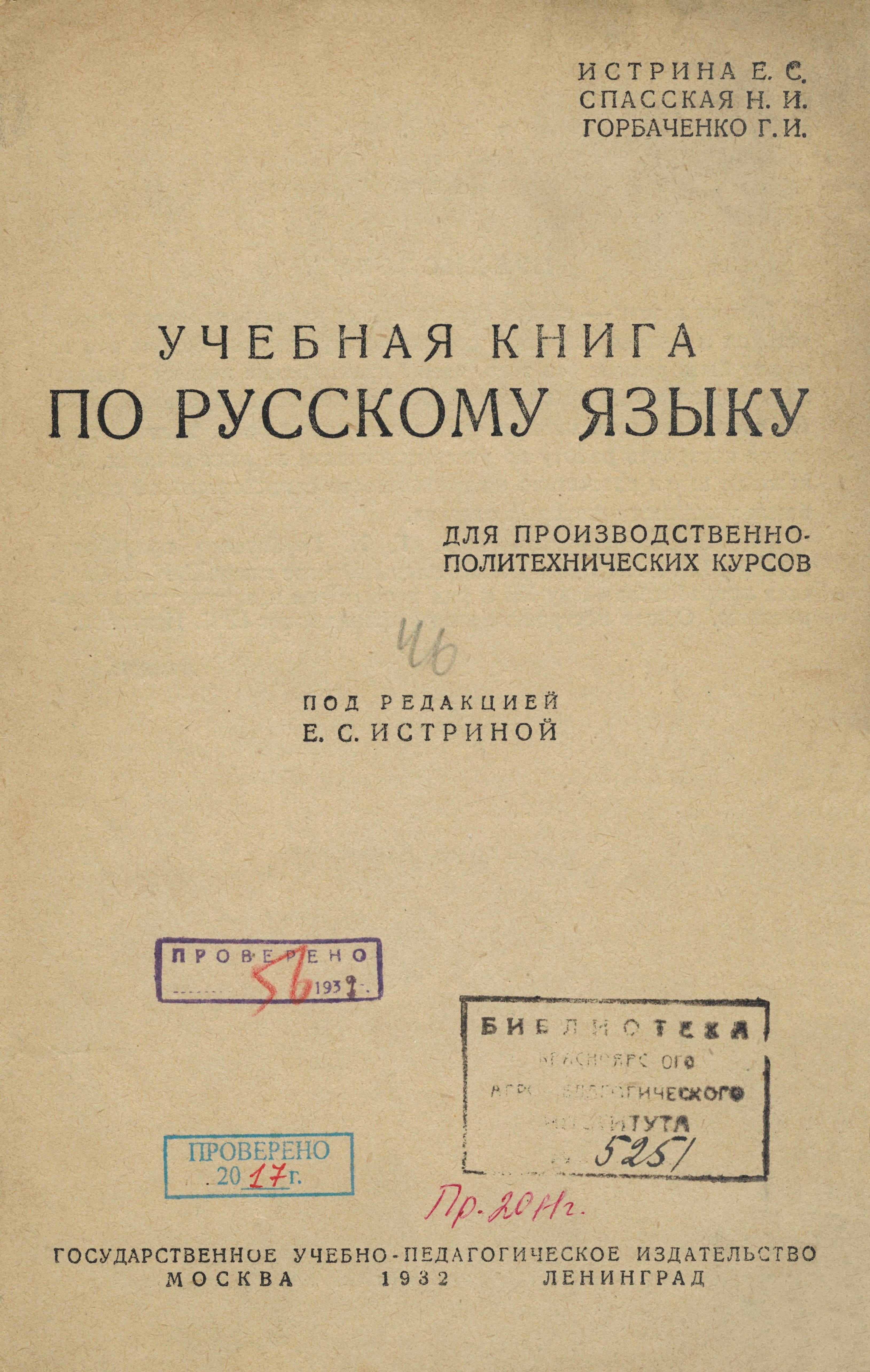 Истрина, Евгения Самсоновна. Учебная книга по русскому языку : для производ.-политехн. курсов / Е. С. Истрина, Н. И. Спасская, Г. И. Горбаченко ; под ред. Е. С. Истриной. - Москва ; Ленинград : Учпедгиз, 1932 (Л. : тип. им. Евг. Соколовой). - Обл., 128 с. : ил.
