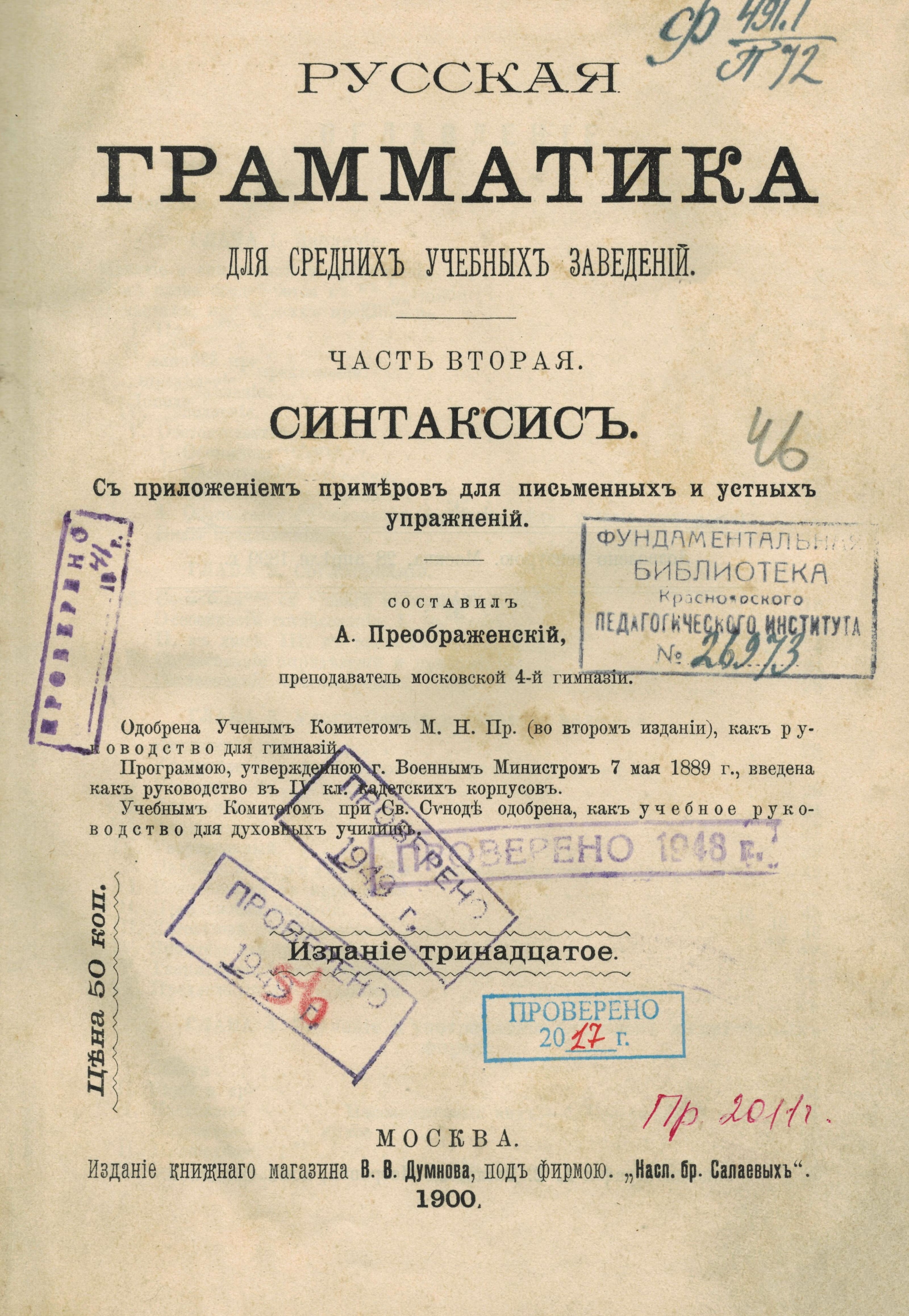 Преображенский, Александр Григорьевич. Русская грамматика для средних учебных заведений : с прил. примеров для письменных и устных упражнений. Ч. 2. Синтаксис / сост. А. Преображенский, преп. 4-й Моск. гимназии. - 13-е изд. - Москва : кн. маг. В. В. Думнова п/ф "Насл. бр. Салаевых", 1900. - 2 т.