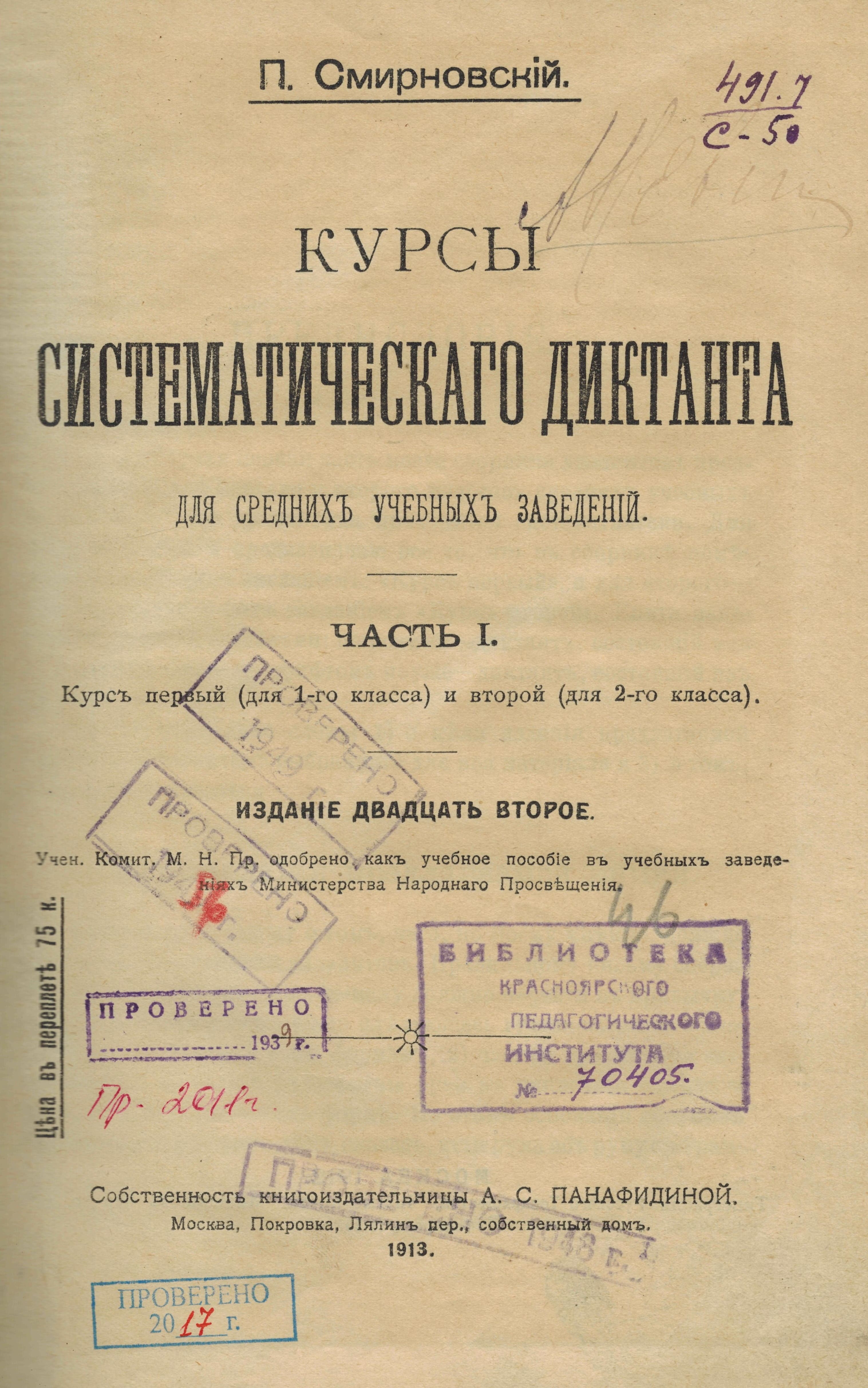 - Смирновский, Петр Владимирович. Курсы систематического диктанта : для сред. учеб. заведений. Ч. 1. / сост. П. Смирновский. - 15-е изд. - Москва : А. Я. Панафидин, 1899.