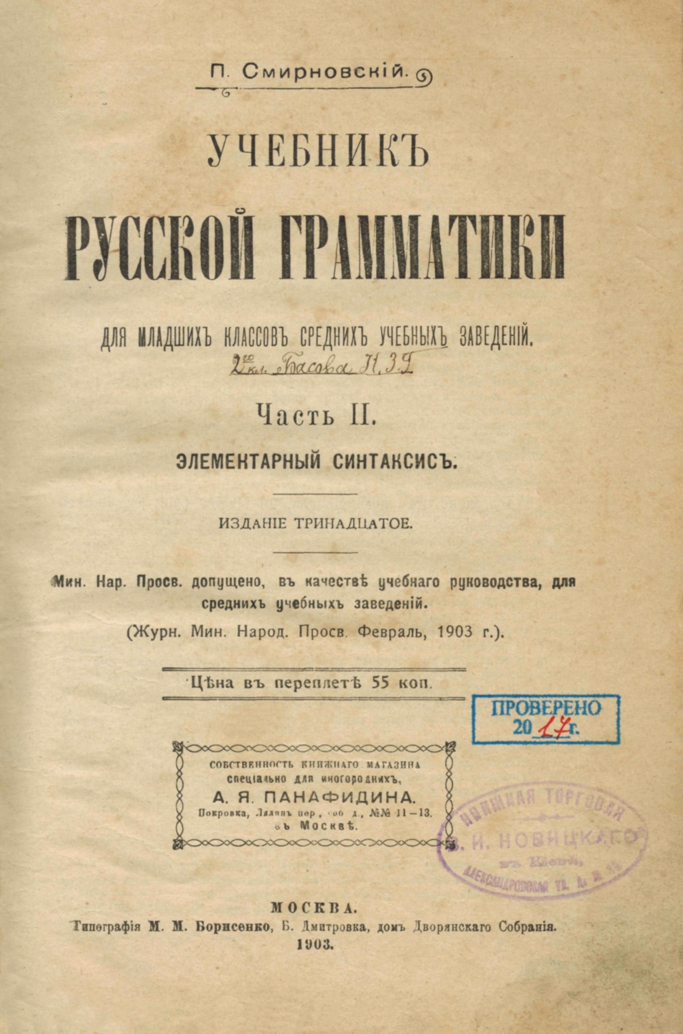 Смирновский, П. Учебник русской грамматики : для младших классов средних учебных заведений. Ч. 2. Элементарный синтаксис / П. Смирновский. – 13-е изд. - Москва : Типография М. М. Борисенко, 1903. - 130 с.