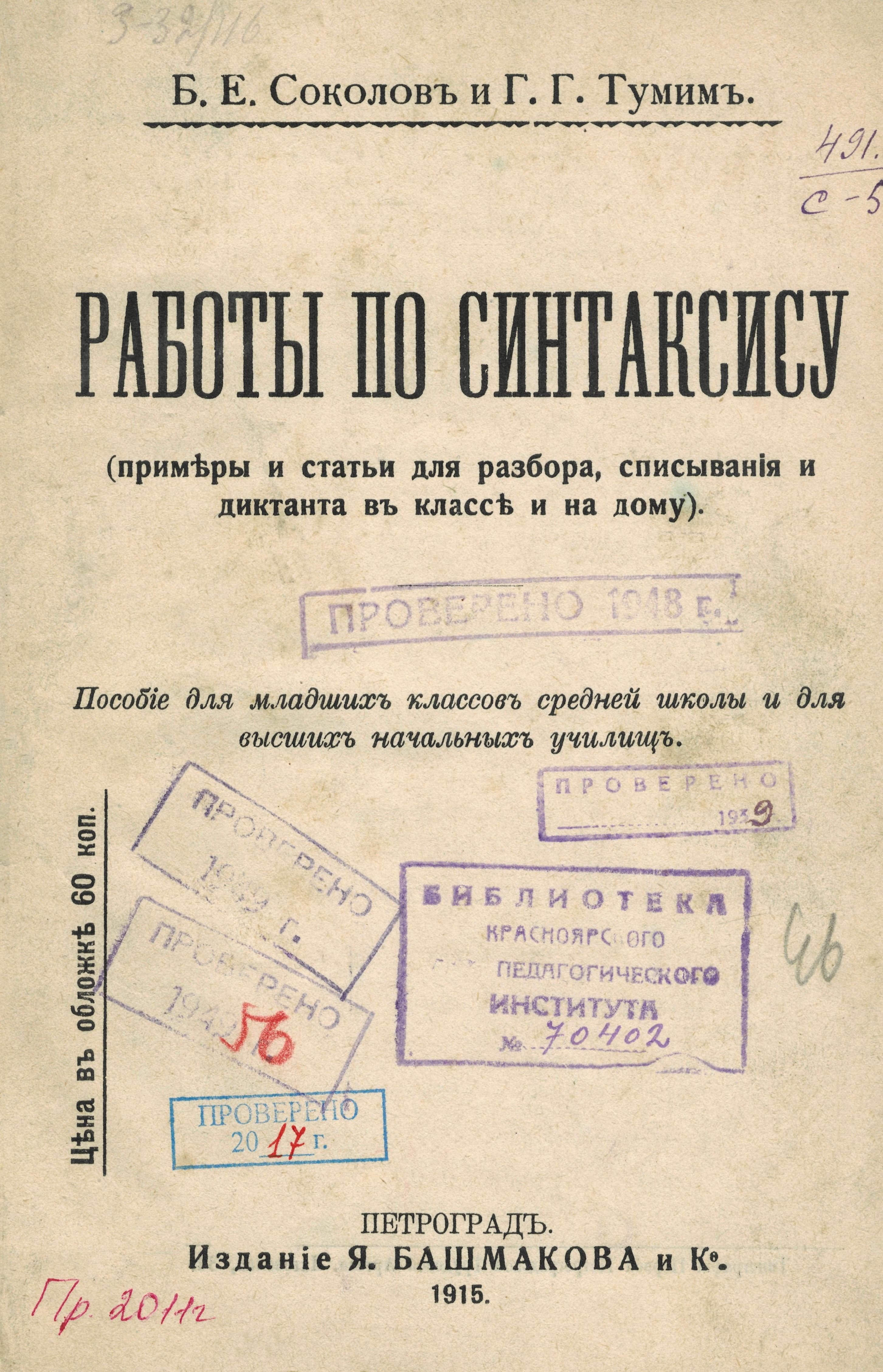Соколов, Борис Ефимович. Работы по синтаксису (примеры и статьи для разбора, списывания и диктанта в классе и на дому) : пособие для мл. классов сред. шк. и для высш. нач. уч-щ / Б. Е. Соколов, Г. Г. Тумим. - Петроград : Я. Башмаков и К°, 1915. - [2], IV, IV, 152 с.